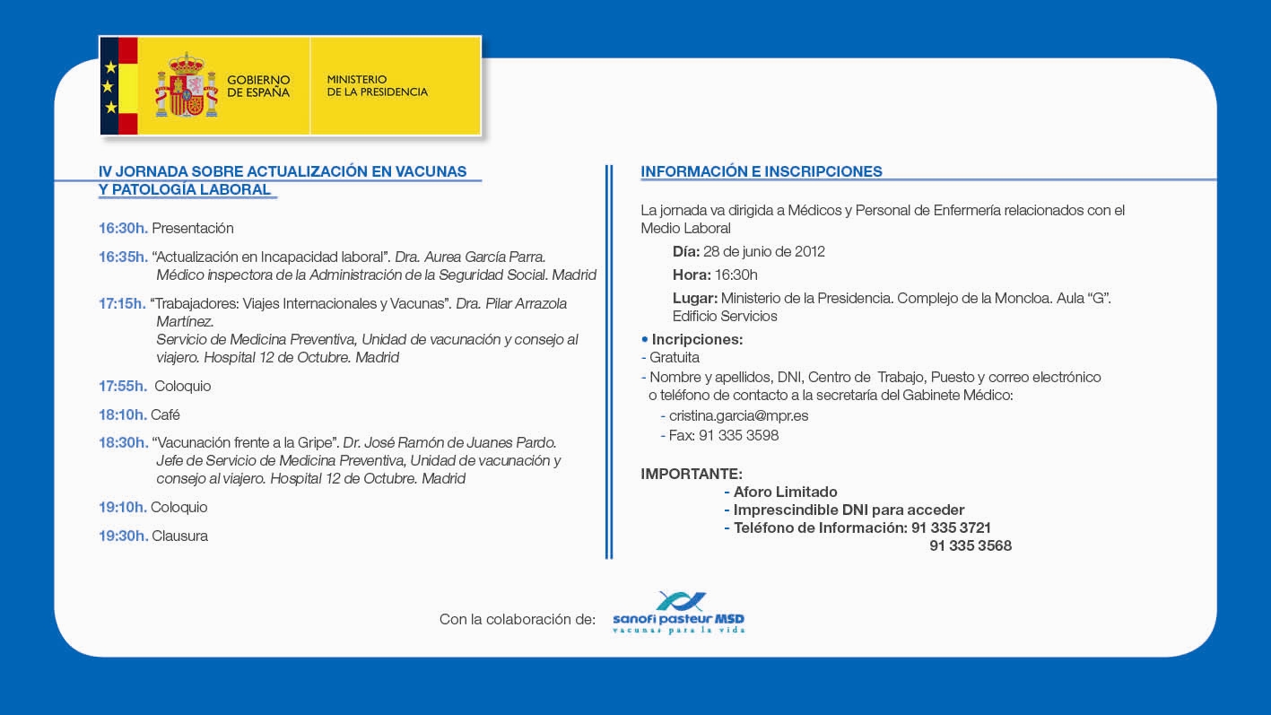 IV Jornada sobre Atualización en Vacunas y Patología Laboral. Mnisterio de la Presidencia. Colabora Sanofi-Pasteur-MSD |